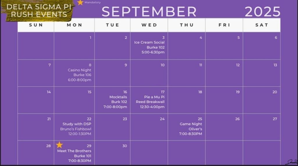 Prospective members must attend at least 1 rush event to be considered. These events are fun ways to get to meet the brothers. In the past, events have included ice cream socials, casino nights, and sledding. After attending a rush event, potential members seeking to join the Mu Pi Chapter must attend Meet the Brothers, a professional event where they will be interviewed and ultimately chosen to be or not to be accepted as a pledge.